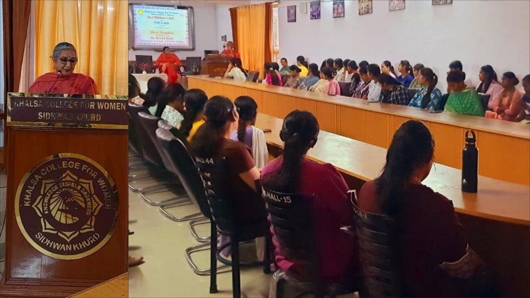 Khalsa College for Women, Sidhwan Khurd, a renowned institution run under the aegis of Shri Guru Hargobind Ujagar Hari Trust, successfully organized a guest lecture on blood donation under the NSS Special Camp, in collaboration with the Red Ribbon Club. The session was graced by the esteemed speaker, Dr. Roohi Deol from Deol Hospital, Mullanpur. College Principal, Dr. Satinder Kaur, formally welcomed the guest by presenting a green sapling as a token of respect and appreciation. During the session, Dr. Roohi Deol elaborated on the health benefits, myths and facts related to blood donation, inspiring students to become responsible contributors to society. She highlighted how voluntary blood donation can save countless lives and encouraged students to actively participate in such noble causes. She clarified various misconceptions and reassured the volunteers about the safety and simplicity of the blood donation process. She pointed up how voluntary blood donation plays a crucial role in meeting the constant demand for blood in hospitals. As a mark of gratitude, a memento was presented to the guest speaker. The stage proceedings were efficiently conducted by Red Ribbon Club Incharges, Prof. Hardeep Kaur and Prof. Gurjeet Singh. The formal vote of thanks was proposed by NSS Programme Officer, Dr. Inderjit Kaur, who expressed heartfelt gratitude to the speaker, organizers, and participants for making the event a success. Around 70 NSS volunteers actively participated in the lecture, making the session highly engaging and impactful.