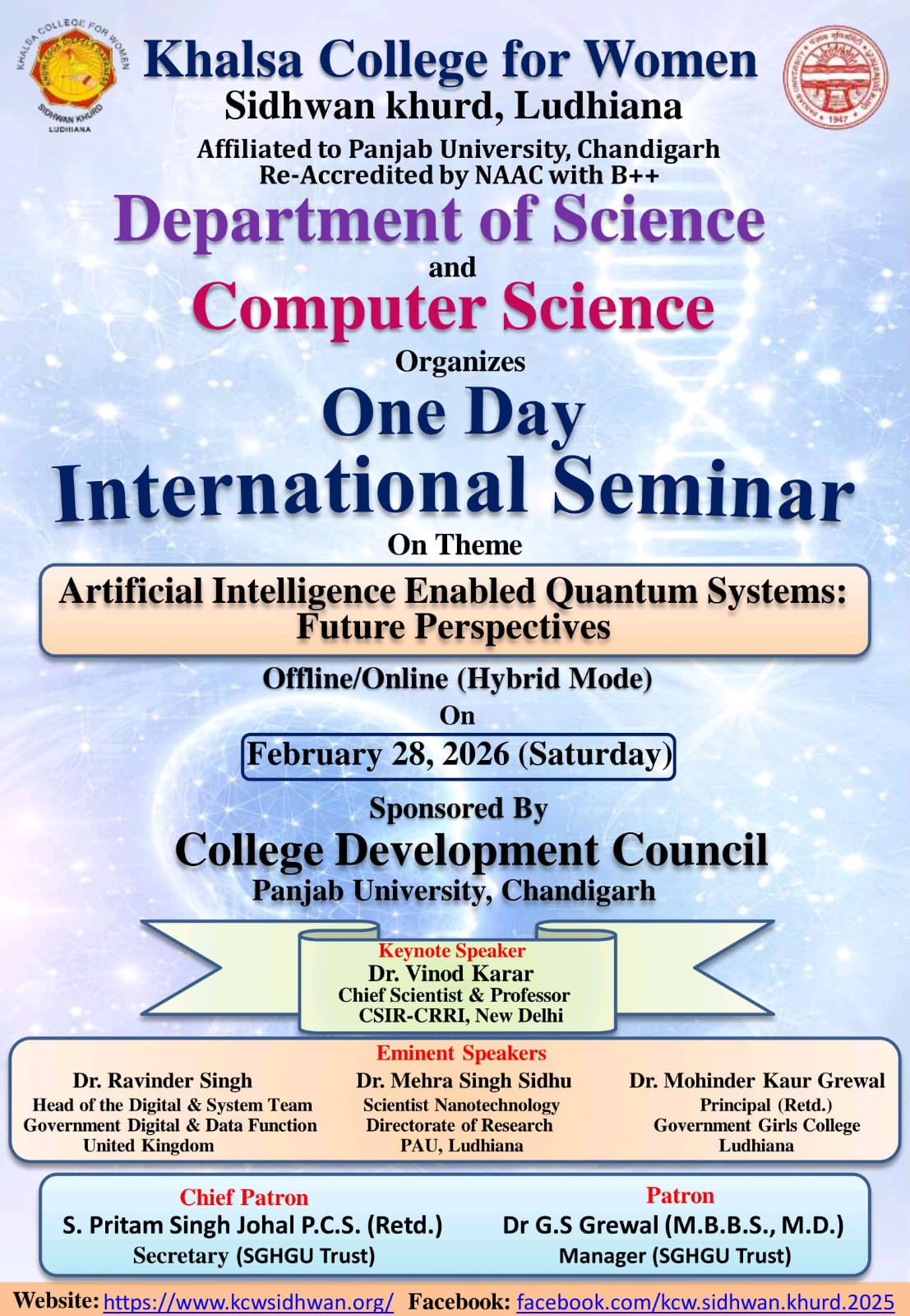 It is my pleasure to welcome you to Khalsa College for Women, Sidhwan Khurd. As the Principal of this illustrious institution, I am honored to lead a vibrant academic community dedicated to excellence in education. Khalsa College for Women was established to impart value based higher education for promoting education among rural women. Women empowerment and women education is the vision of Padam