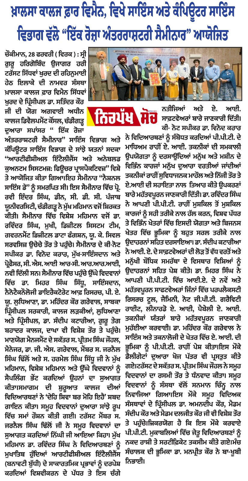 International Seminar on the theme ' Artificial Intelligence Enabled Quantum Systems: Future Perspectives ' sponsored by CDC, Panjab University , Chandigarh was organized by the Science Department of Khalsa College for Women Sidhwan Khurd on the occasion of National Science Day under the aegis of SGHGU Hari Trust and able guidance of Principal, Dr. Satinder Kaur. Dr. Ravi Inder Singh, Dean, College Development Council , PU, Chandigarh adorned the event as Chief Guest. The key note speaker Dr. Ravinder Singh, Head of the Digital and System Team, Government Digital and Data Function , UK was the Guest of Honour. The key note address was delivered by Dr. Vinod Karar, Chief Scientist and Professor , CSIR- CRRI, New Delhi. A galaxy of eminent speakers graced this confluence of minds including Dr. Mehr Singh Sidhu, Scientist, Nanotechnology, Directorate of Research , PAU, Ludhiana, Dr. Mohinder Kaur Grewal, Principal ( Retd.) , Govt. Girls College, Ludhiana and Dr. Sandeep Kataria, Principal, Guru Teg Bahadur College, Dakha who enlightened the audience. The programme commenced with invoking Almighty's blessings through Shabad Recital. This was followed by the ceremonial lamp lighting. The distinguished guests were accorded a green greeting with saplings. S. Jarnail Singh Dhillon , Honourable Member, SGHGU Hari Trust formally welcomed the distinguished personalities, delegates and participants. Dr. Ravi Inder Singh addressed the audience and said that AI is not a technology but a civilizational shift as it has penetrated all fields of life. He dwelt upon the ethical concerns of AI and inspired the students to become skilled thinkers and entrepreneurs. Dr. Vinod Karar highlighted the relevance and use of AI in various fields for enhancing human capabilities. He stressed the need to develop indigenous technology for self reliance. Dr. Ravinder Singh highlighted the applications of Quantum Computing and how it can dramatically improve the functioning of technology in future while also curbing data theft. Dr. Sandeep Kataria shared interesting anecdotes and information related to the daily impact of AI. He emphasized the need for updating ourselves to compete with evolving scientific inventions. Dr. Mehr Singh Sidhu shared the relevance and applicability of various AI tools like Perplexity, Deepseek, Gamma etc. Dr. Mohinder Kaur Grewal told about the scope of AI in Science and Technology and recited a poem on the unprecedented effects and apprehensions of AI. Paper Presentations touching upon the multiple aspects of the topic were conducted in hybrid mode. The dignitaries were felicitated with lohis and momentoes. A Power Point Presentation competition for students was organized and the winners were awarded. S. Pritam Johal , Secretary SGHGU Hari Trust proposed the formal vote of thanks. Dr. G. S Grewal , Manager and S. Harmail Singh, Senior Member respectively of SGHGU Hari Trust enriched the programme with their benign presence. Dr. Amandeep Kaur, Mrs. Daljit Kaur and Ms. Sandeep Kaur Principals of sister institutions under the management attended the event. The function concluded with singing of National Anthem. Dr. Manpreet Kaur conducted the proceedings effectively.